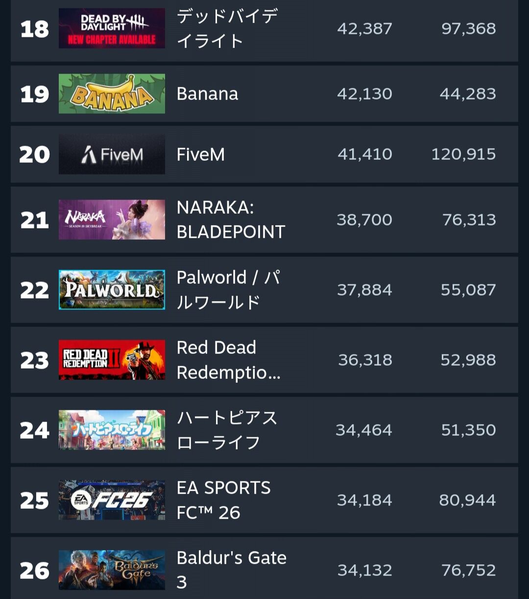 【画像】任天堂と争ったパルワールドさんの現在がこちらwwwwwww 2026年1月30日 最終更新日時 : 2026年1月30日 kuruppe 【芸能】内田有紀、意外な人と意外な場所で寄り添いショットに「羨ましいぞ!」 【185km/h】広末涼子、活動再開を発表 ワイが好きな芸人、山田ルイ53世、松井ケムリ、山口智充、大自然ロジャー、和田まんじゅう ぼく「A作る」上司「B作れ」ぼく「先にA作らないと効率悪い」上司「黙れ!Bを優先!B作れ!」→上司「Aが動かない!!」 小堺一機、自宅転倒のけがでミュージカル休演 【芸能】赤西仁と広瀬アリスが昨年末に破局… 所属事務所否定せず 【アウト】オフィスグリコでごまかして購入してたのバレて今日すごい怒られた。クビとかにはならないし請求もなかったけど😭 キンコン西野、映画「プペル」が苦戦 バカにしてくる人をどう思う?に回答「大体はおじさんの嫉妬」 【悲報】ワイは剣、社員からウォーターサーバー使用禁止にされ困惑 今日スマートバンド届くけど睡眠の質良くなるのかね 【画像】任天堂と争ったパルワールドさんの現在がこちらwwwwwww (出典 4Gamer) 世界観すこ (出典 【悲報】パルワールドさんの現在…) 1 それでも動く名無し :2026/01/28(水) 20:03:40.97 ID:Evn8JTFA0 普通にどの日でも5、6万人がプレイしてる模様 steam世界22位 ポケモンのランクマより人多そう (出典 i.imgur.com) (出典 【悲報】パルワールドさんの現在…) 続きを読む 続きを見る 【芸能】内田有紀、意外な人と意外な場所で寄り添いショットに「羨ましいぞ!」 【185km/h】広末涼子、活動再開を発表 ワイが好きな芸人、山田ルイ53世、松井ケムリ、山口智充、大自然ロジャー、和田まんじゅう ぼく「A作る」上司「B作れ」ぼく「先にA作らないと効率悪い」上司「黙れ!Bを優先!B作れ!」→上司「Aが動かない!!」 小堺一機、自宅転倒のけがでミュージカル休演 【芸能】赤西仁と広瀬アリスが昨年末に破局… 所属事務所否定せず 【アウト】オフィスグリコでごまかして購入してたのバレて今日すごい怒られた。クビとかにはならないし請求もなかったけど😭 キンコン西野、映画「プペル」が苦戦 バカにしてくる人をどう思う?に回答「大体はおじさんの嫉妬」 関連記事 【衝撃】乃木坂46 井上和、イコラブ佐々木舞香の熱愛より炎上の理由がエグい… 【バレー】性的な意図の画像拡散 アルテミス北海道はユニホーム変更で対策 水卜麻美アナ、「好きなおでんの具材は?」に即答 スヌーピー × MLBのコラボスタジャンでアメカジを楽しもう!
