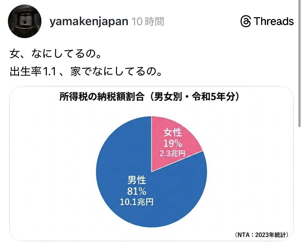 【画像】納税額、男女で違いすぎて草も生えない… 2026年2月1日 最終更新日時 : 2026年2月1日 kuruppe 小堺一機、自宅転倒のけがでミュージカル休演 【芸能】赤西仁と広瀬アリスが昨年末に破局… 所属事務所否定せず 【アウト】オフィスグリコでごまかして購入してたのバレて今日すごい怒られた。クビとかにはならないし請求もなかったけど😭 キンコン西野、映画「プペル」が苦戦 バカにしてくる人をどう思う?に回答「大体はおじさんの嫉妬」 【悲報】ワイは剣、社員からウォーターサーバー使用禁止にされ困惑 今日スマートバンド届くけど睡眠の質良くなるのかね 【朗報】商船三井のLNG船がホルムズ海峡を通過 日本関係船舶では初 レイザーラモン住谷「フォーーー!(腰カクカク)」10年前お前ら「ゲラゲラ」 やす子がXで無茶苦茶嫌われとる件 【悲報】新入社員さん、入社初日から退職代行😭 【画像】納税額、男女で違いすぎて草も生えない… (出典 いらすとや) しゃーないんやろうけど働くモチベ下がりますよ (出典 【衝撃】税金の8割、男が納めていたwww女は2割) 1 それでも動く名無し :2026/01/30(金) 07:47:04.80 ID:BHtjJMvJ0 (出典 i.imgur.com) (出典 【衝撃】税金の8割、男が納めていたwww女は2割) 続きを読む 続きを見る 小堺一機、自宅転倒のけがでミュージカル休演 【芸能】赤西仁と広瀬アリスが昨年末に破局… 所属事務所否定せず 【アウト】オフィスグリコでごまかして購入してたのバレて今日すごい怒られた。クビとかにはならないし請求もなかったけど😭 キンコン西野、映画「プペル」が苦戦 バカにしてくる人をどう思う?に回答「大体はおじさんの嫉妬」 【悲報】ワイは剣、社員からウォーターサーバー使用禁止にされ困惑 今日スマートバンド届くけど睡眠の質良くなるのかね 【朗報】商船三井のLNG船がホルムズ海峡を通過 日本関係船舶では初 レイザーラモン住谷「フォーーー!(腰カクカク)」10年前お前ら「ゲラゲラ」 関連記事 【芸能】アイドルがファミレスのラストオーダーの対応に怒り!「意味わからん」…意見様々「じゃあ受けるなよ」「帰りたいんだよ」 【画像】AKB48の次世代ツートップが賛否両論でヤバい… 【芸能】西野亮廣、「クラウドファンディングは詐欺だ!」と批判した先輩がクラファンで苦戦「さすがに救いようが無い」 【超絶朗報】アマプラビデオの2月の配信予定、強すぎるwwwwwwwww