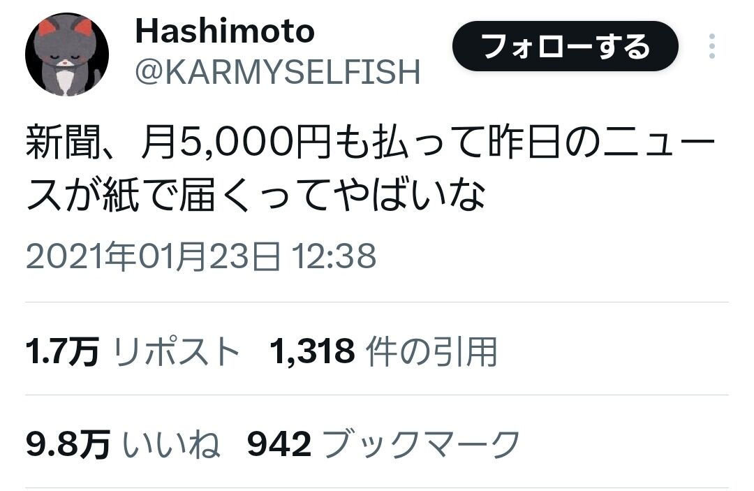 【画像】若者、新聞に疑問を持ってしまうwwwww 2026年3月28日 最終更新日時 : 2026年3月28日 kuruppe 【悲報】ブロッコリー、マヨネーズ以外おいしい食べ方がない エコノミスト誌「敵がミスをしているときに邪魔をするな」 【芸能】内田有紀、意外な人と意外な場所で寄り添いショットに「羨ましいぞ!」 【185km/h】広末涼子、活動再開を発表 ワイが好きな芸人、山田ルイ53世、松井ケムリ、山口智充、大自然ロジャー、和田まんじゅう ぼく「A作る」上司「B作れ」ぼく「先にA作らないと効率悪い」上司「黙れ!Bを優先!B作れ!」→上司「Aが動かない!!」 小堺一機、自宅転倒のけがでミュージカル休演 【芸能】赤西仁と広瀬アリスが昨年末に破局… 所属事務所否定せず 【アウト】オフィスグリコでごまかして購入してたのバレて今日すごい怒られた。クビとかにはならないし請求もなかったけど😭 キンコン西野、映画「プペル」が苦戦 バカにしてくる人をどう思う?に回答「大体はおじさんの嫉妬」 【画像】若者、新聞に疑問を持ってしまうwwwww (出典 irasutoya.jp) 今はネットニュースですぐチェック出来ちゃうからなあ (出典 Z世代「新聞、月5000円払って昨日のニュースが紙で届くってやばくね?笑」9万いいね) 1 それでも動く名無し :2026/03/23(月) 08:00:07.78 ID:UMpltjsX0 やばい (出典 i.imgur.com) (出典 Z世代「新聞、月5000円払って昨日のニュースが紙で届くってやばくね?笑」9万いいね) 続きを読む 続きを見る 【悲報】ブロッコリー、マヨネーズ以外おいしい食べ方がない エコノミスト誌「敵がミスをしているときに邪魔をするな」 【芸能】内田有紀、意外な人と意外な場所で寄り添いショットに「羨ましいぞ!」 【185km/h】広末涼子、活動再開を発表 ワイが好きな芸人、山田ルイ53世、松井ケムリ、山口智充、大自然ロジャー、和田まんじゅう ぼく「A作る」上司「B作れ」ぼく「先にA作らないと効率悪い」上司「黙れ!Bを優先!B作れ!」→上司「Aが動かない!!」 小堺一機、自宅転倒のけがでミュージカル休演 【芸能】赤西仁と広瀬アリスが昨年末に破局… 所属事務所否定せず 関連記事 1番 懐かしい クイズ番組 内定もらった企業がやばすぎて辞退したいんだけどどうにか辞める方法ない?😭 【悲報】ワイ自転車乗り、来月から始まる規制強化が厳しすぎて咽び泣く トランプ大統領「イランの軍事作戦は成功」「次はキューバだ」