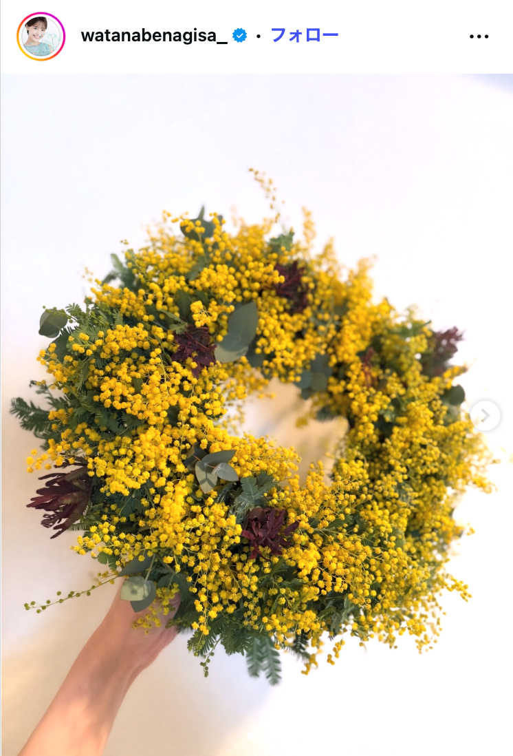渡邊は「3月8日は国際女性デー。ということで、ミモザのリースを作ってみました」とつづり、手作りリースのショットを投稿。「繊細だし、数日したら花が小さくなるのでそれを想定して形を作るのが難しかったです」と小さなミモザの黄色い花を全面にあしらったリースを披露している。