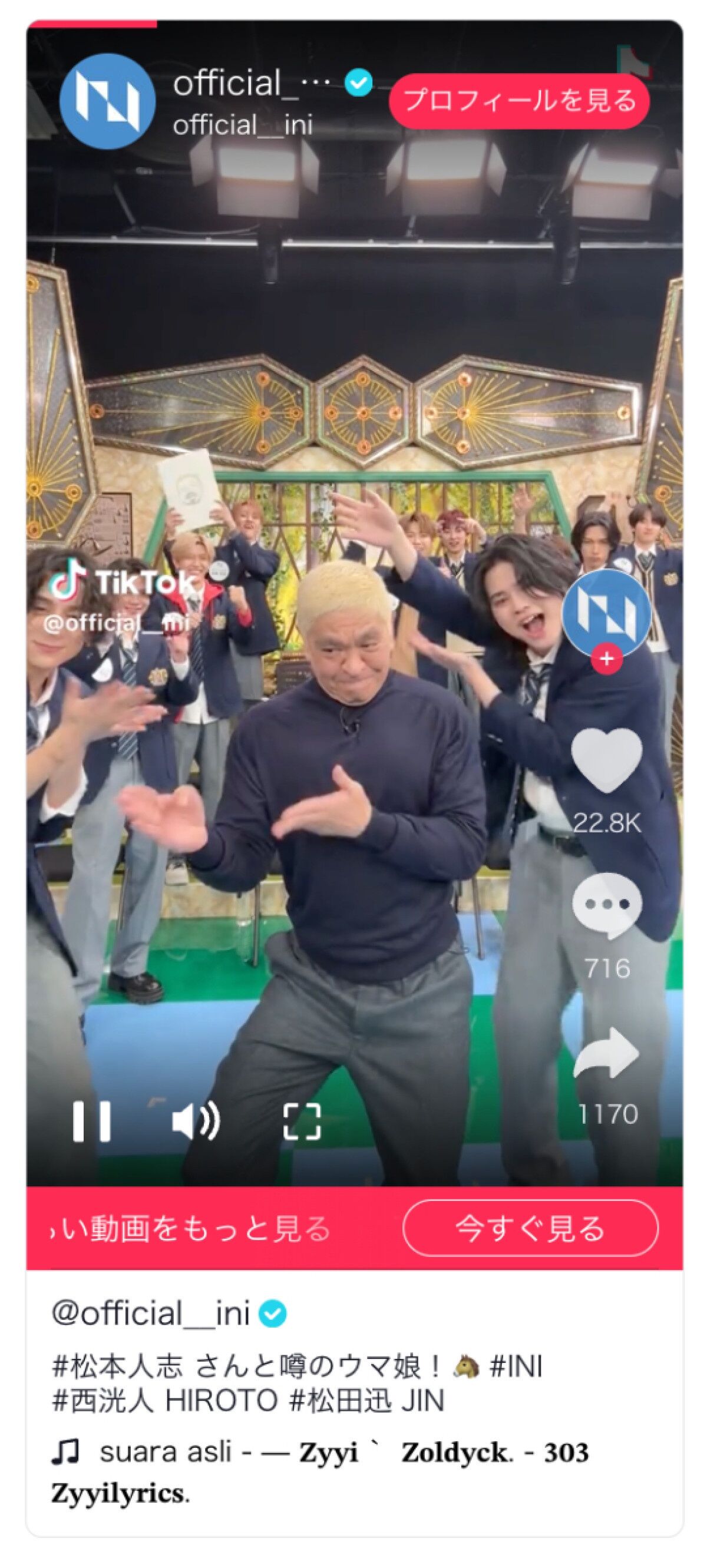 INIが、3月25日(水)に公式TikTokを更新。メンバーの西洸人と松田迅が松本人志とダンスする様子が映し出されており、ファンから驚きの声が上がっている。
