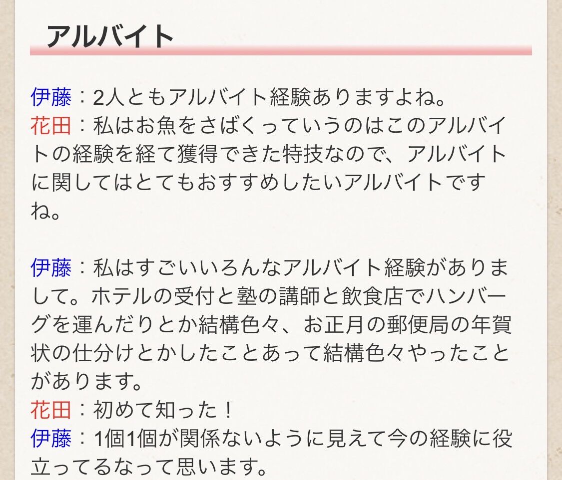 伊藤:私はすごいいろんなアルバイト経験がありまして。ホテルの受付と塾の講師と飲食店でハンバーグを運んだりとか結構色々、お正月の郵便局の年賀状の仕分けとかしたことあって結構色々やったことがあります。