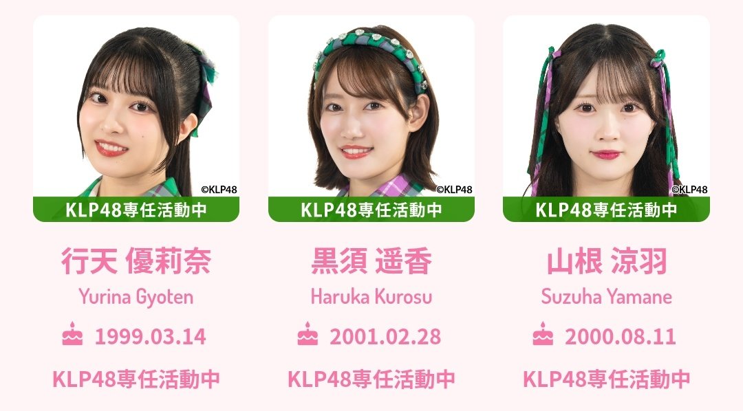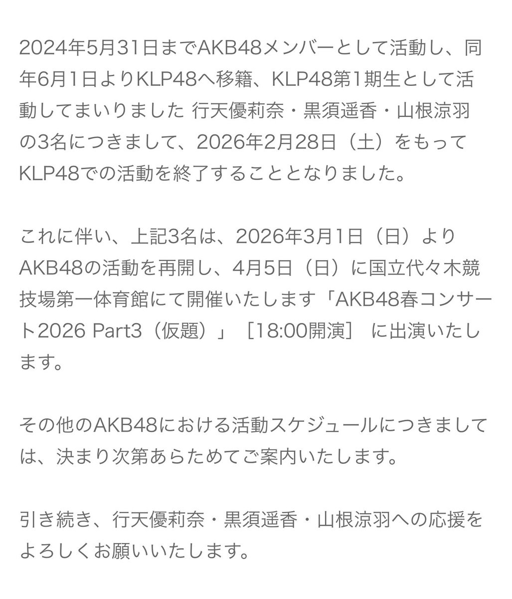 …LP48へ移籍、KLP48第1期生として活動してまいりました行天優莉奈・黒須遥香・山根涼羽の3名につきまして、2026年2月28日(土)をもってKLP…