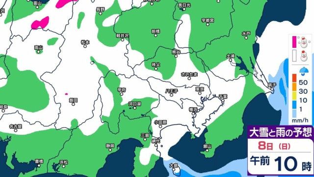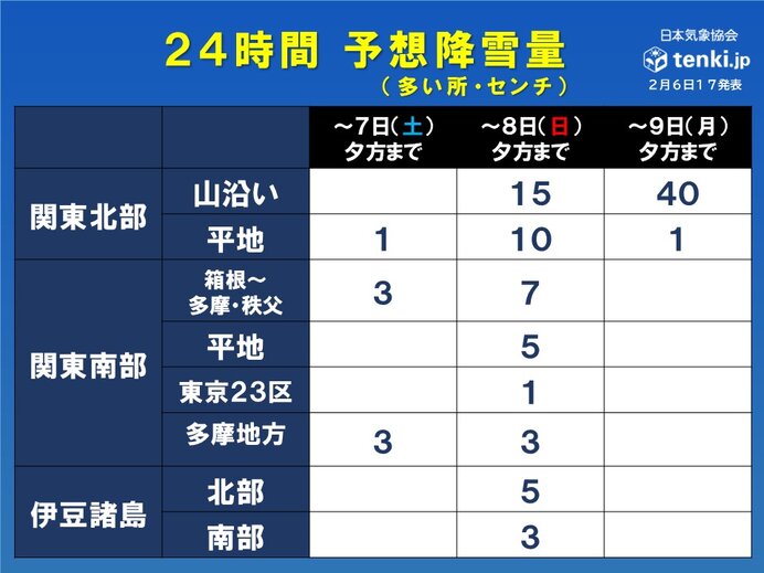 7日から8日にかけての総降雪量は多い所で、埼玉南部・北部で8センチ、秩父で15センチ、東京23区で3センチと予想しており、平地でも大雪となる恐れがある。予想より地上気温が低くなった場合や、降水量が多くなった場合には、大雪となる地域が拡大する可能性がある。