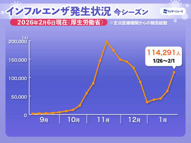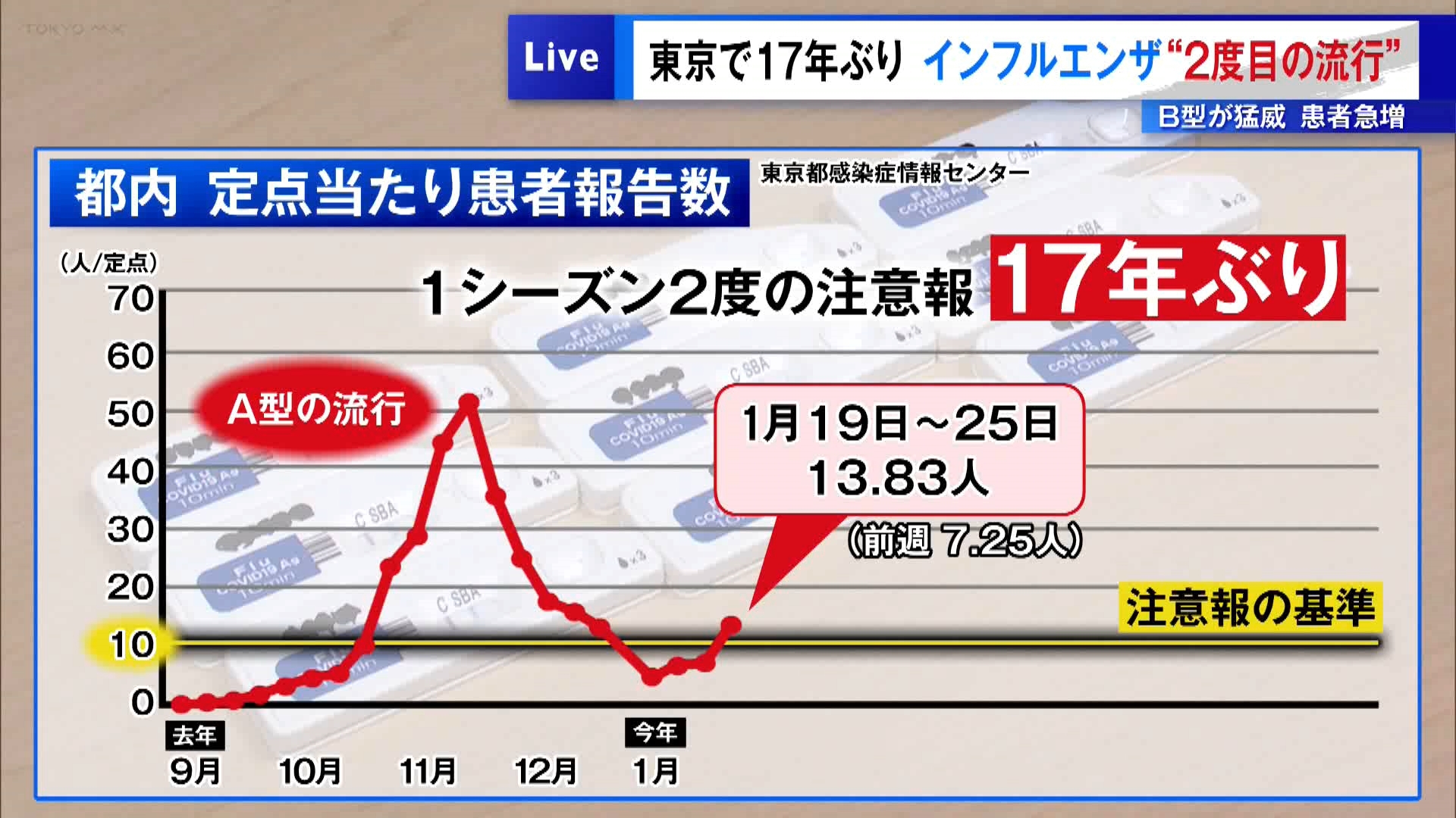 去年=2025年11月に続き、1シーズンで2度警報基準を超えるのは、1999年に現行の統計が始まって以来初めてです。東京都によりますと報告されたウイルスのおよそ9割がB型で、今シーズンのワクチンはB型にも有効だということです。