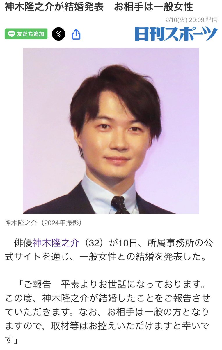 サイトでは「ご報告 平素よりお世話になっております。この度、神木隆之介が結婚したことをご報告させていただきます」と発表。続けて「なお、お相手は一般の方となりますので、取材等はお控えいただけますと幸いです」と呼び掛けている。