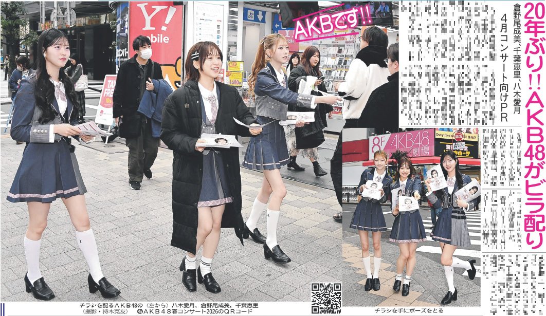 AKB48 原点の秋葉原路上で約20年ぶりチラシ配り 倉野尾成美「感慨深い」サプライズ登場で4月の春コンをアピール AKB48の倉野尾成美(25)、千葉恵里(22)、八木愛月(20)が2日、東京・秋葉原のAKB48劇場周辺にサプライズで登場した。3人で4月の国立… (出典:デイリースポーツ) |